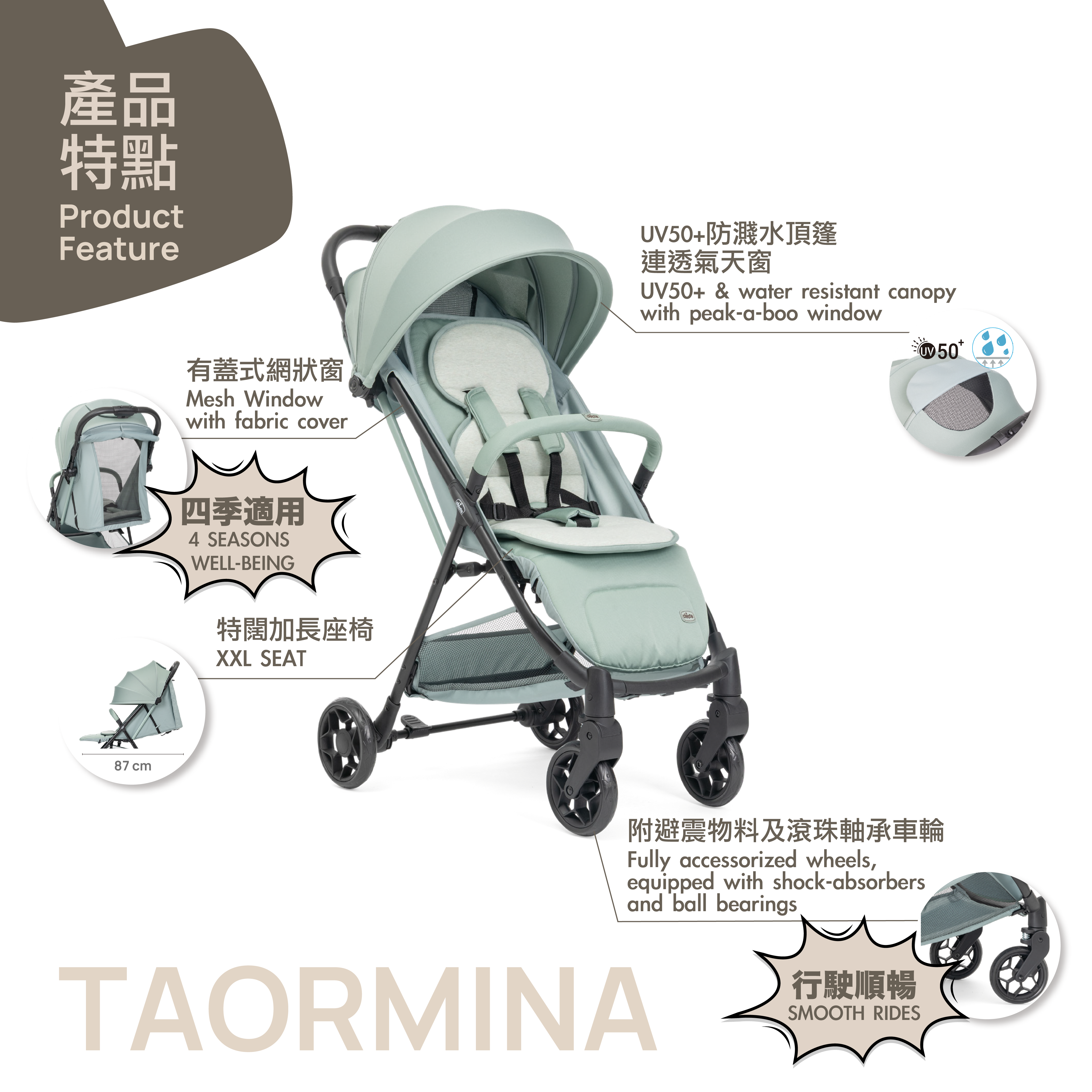 A lightweight and ultra-comfortable stroller designed for children from birth up to 22kg. The Taormina stroller features a wide, extra-long seat and a soft cushion made from natural organic cotton for enhanced comfort.