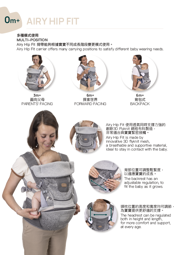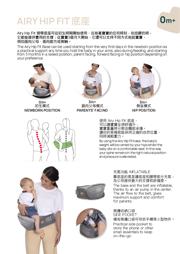 Airy Hip Fit carrier is the ergonomic and multifunctional baby carrier with a detachable base support ideal to satisfy all baby wearing’s needs. It’s made by two elements an inflatable base and a baby carrier – that can be used together or separately giving life to 3 different products and multiple baby wearing options.
